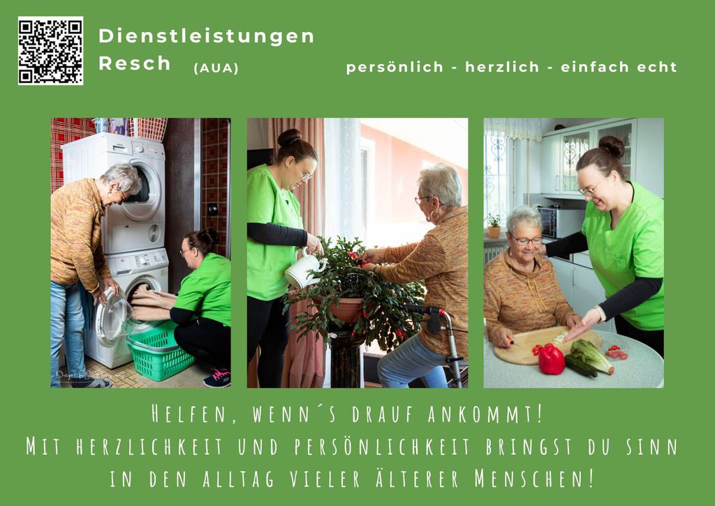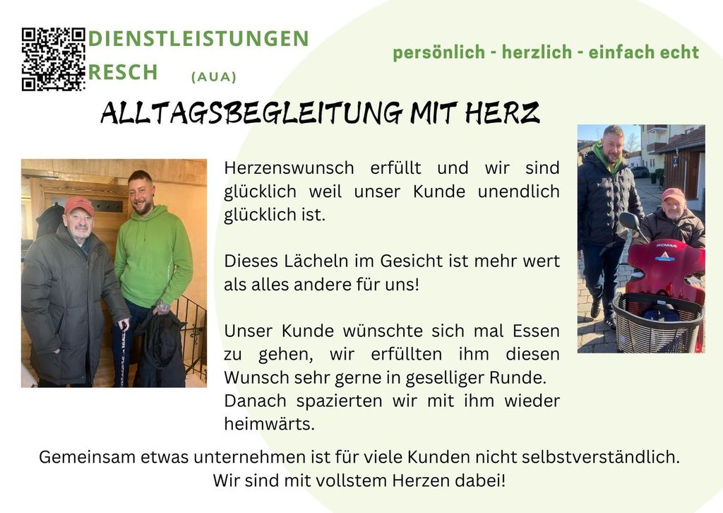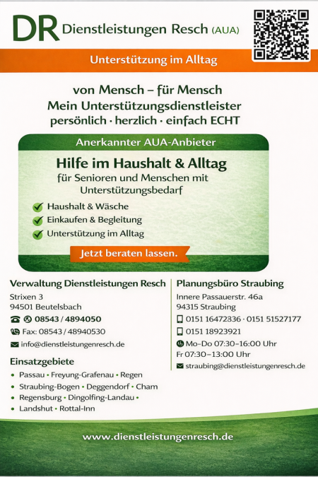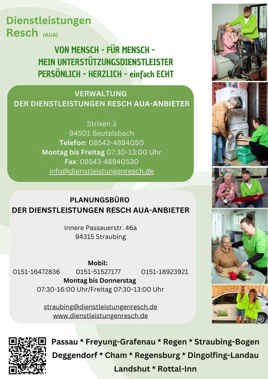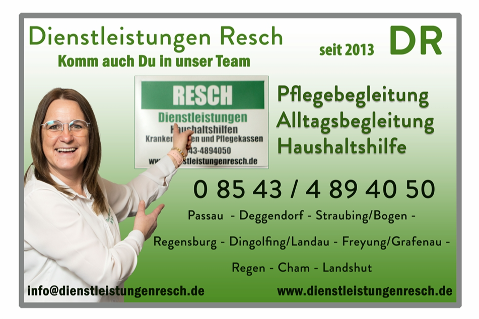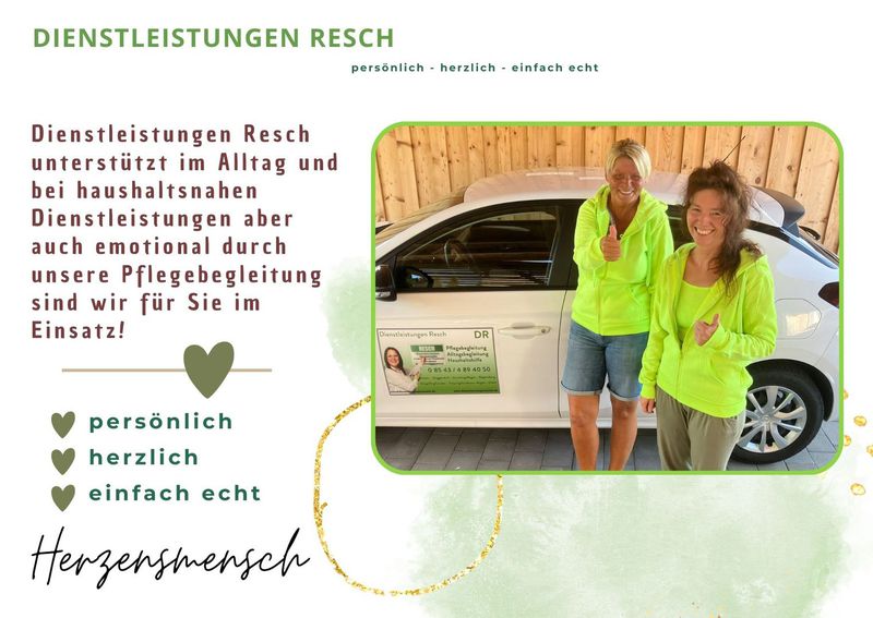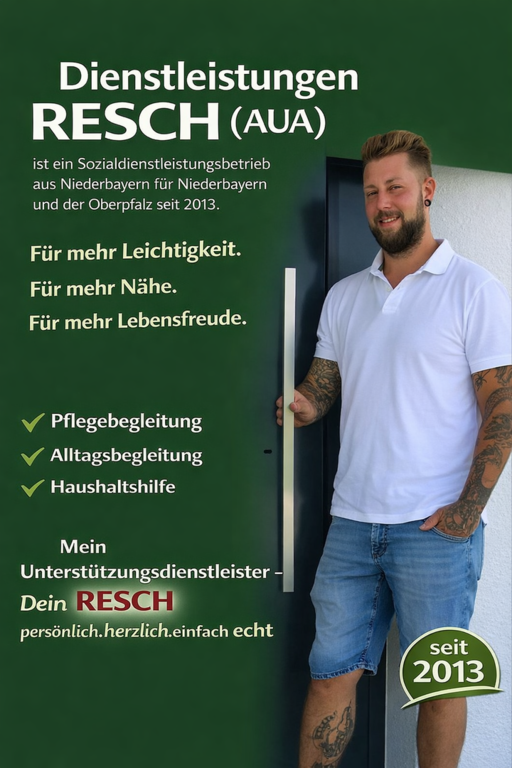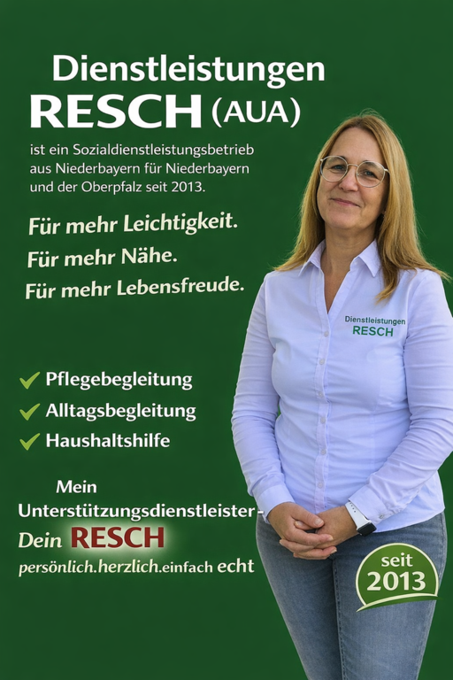 Wir lieben, was wir tun – und tun es mit ganzem Herzen. Helfen in der Pflegebegleitung, Alltagsbegleitung und bei haushaltsnahen Dienstleistungen (Haushaltshilfe) – mit unserem Herzensmenschteam, für Niederbayern und die Oberpfalz. Dienstleistungen Resch (AUA) ist seit 2013 ein familiengeführter Sozialdienstleistungsbetrieb, der mit Leidenschaft, Herzlichkeit & Professionalität arbeitet. Über 80 Herzensmenschen (m/w/d) in 10 Landkreisen begleiten, unterstützen & entlasten dort, wo’s am wichtigsten ist – DAHOAM.