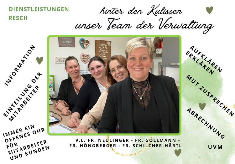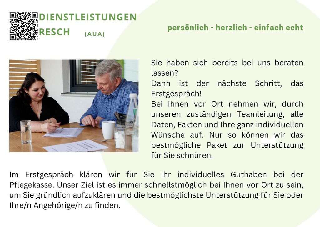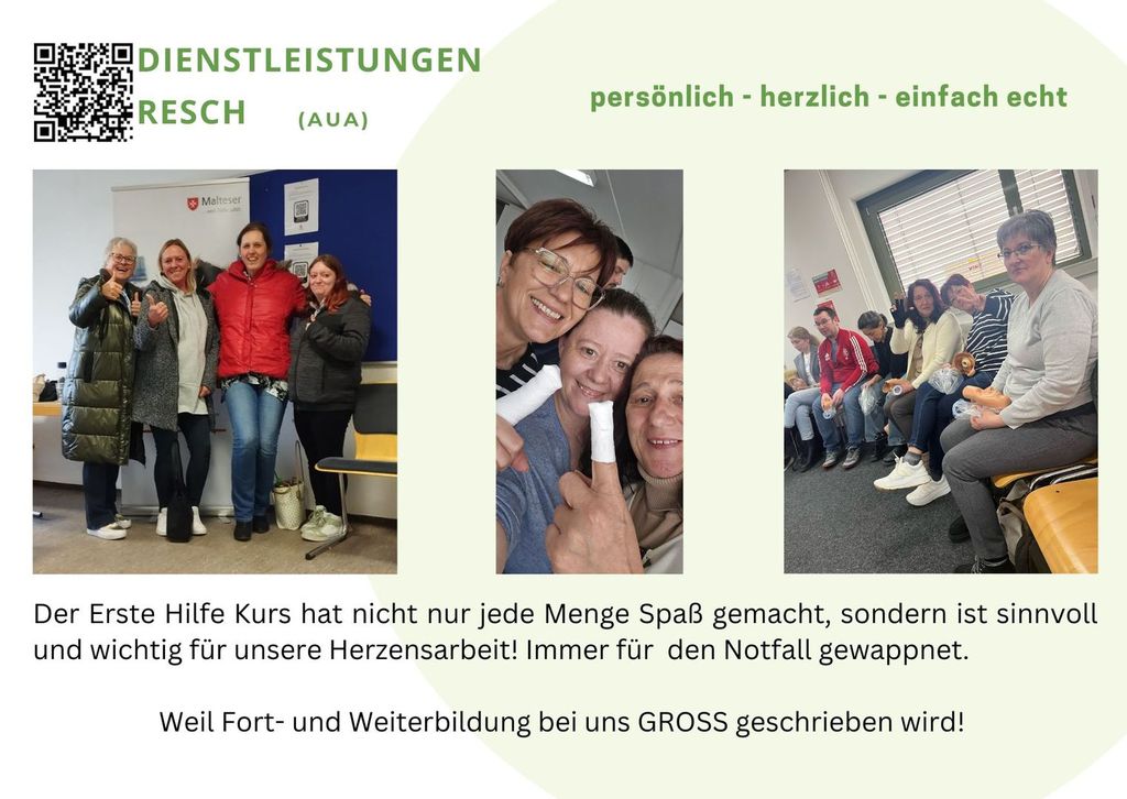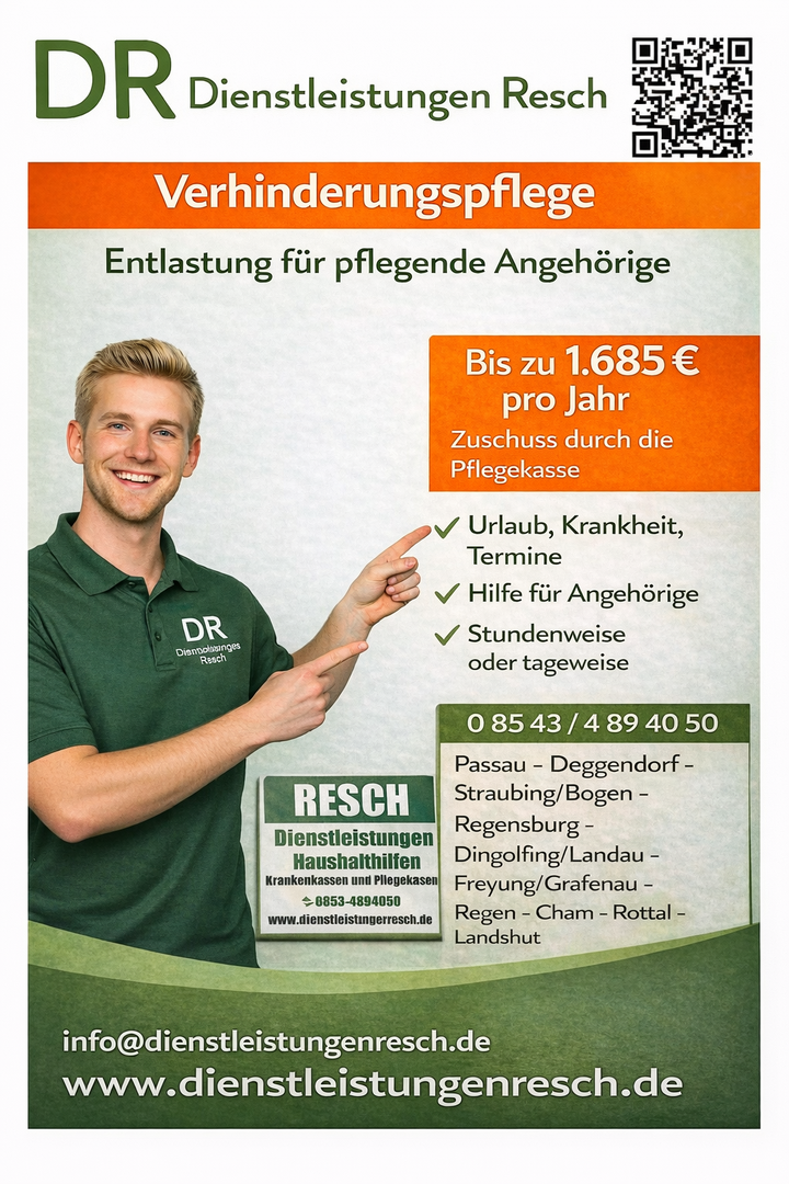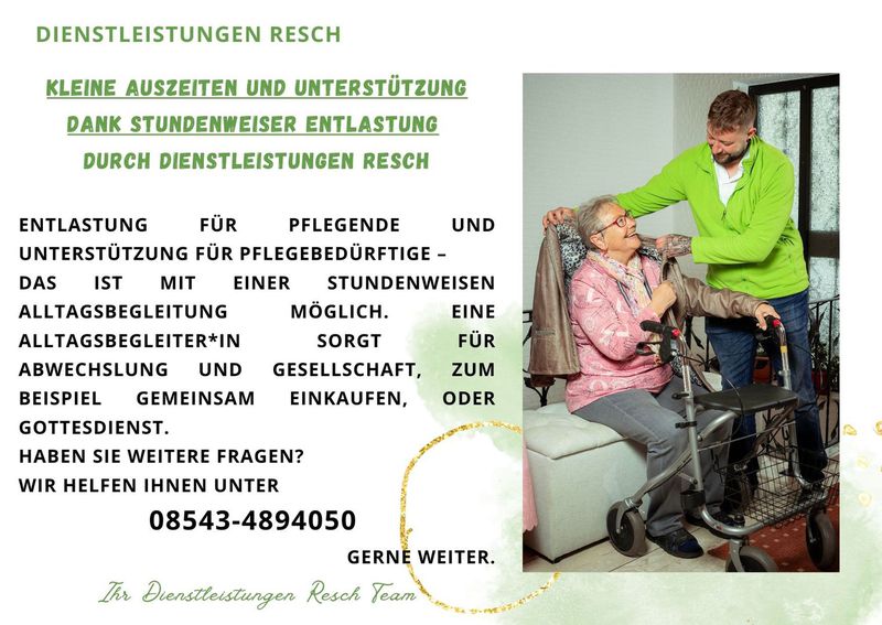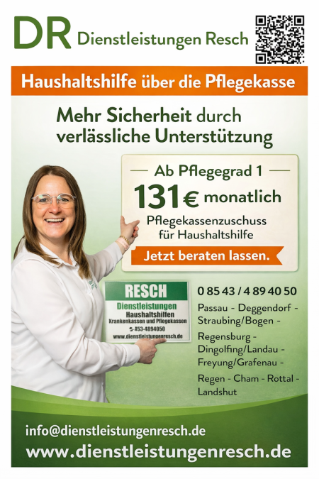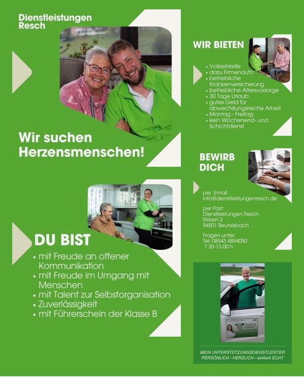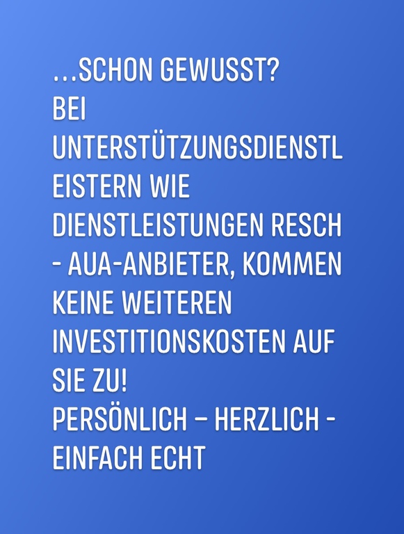 Wir lieben, was wir tun – und tun es mit ganzem Herzen. Helfen in der Pflegebegleitung, Alltagsbegleitung und bei haushaltsnahen Dienstleistungen (Haushaltshilfe) – mit unserem Herzensmenschteam, für Niederbayern und die Oberpfalz. Dienstleistungen Resch (AUA) ist seit 2013 ein familiengeführter Sozialdienstleistungsbetrieb, der mit Leidenschaft, Herzlichkeit & Professionalität arbeitet. Über 80 Herzensmenschen (m/w/d) in 10 Landkreisen begleiten, unterstützen & entlasten dort, wo’s am wichtigsten ist – DAHOAM.